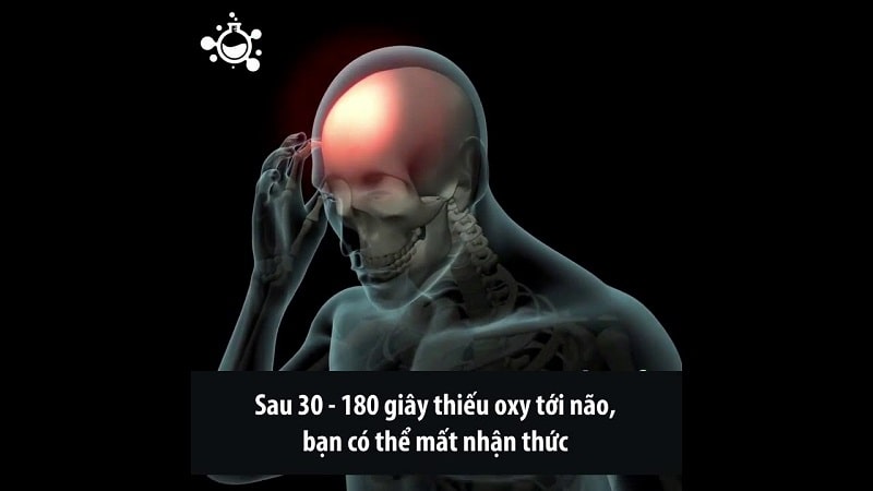Nếu không được cung cấp oxy lên não khoảng 4-5 phút sẽ gây ra hiện tượng tổn thương não, dẫn đến chết não. Ngoài ra, cơ thể thiếu oxy còn là tác nhân gây ra một số bệnh nghiêm trọng như: tắc nghẽn mạch máu, viêm phế quản, hen suyễn, cao huyết áp, suy giảm trí nhớ,...